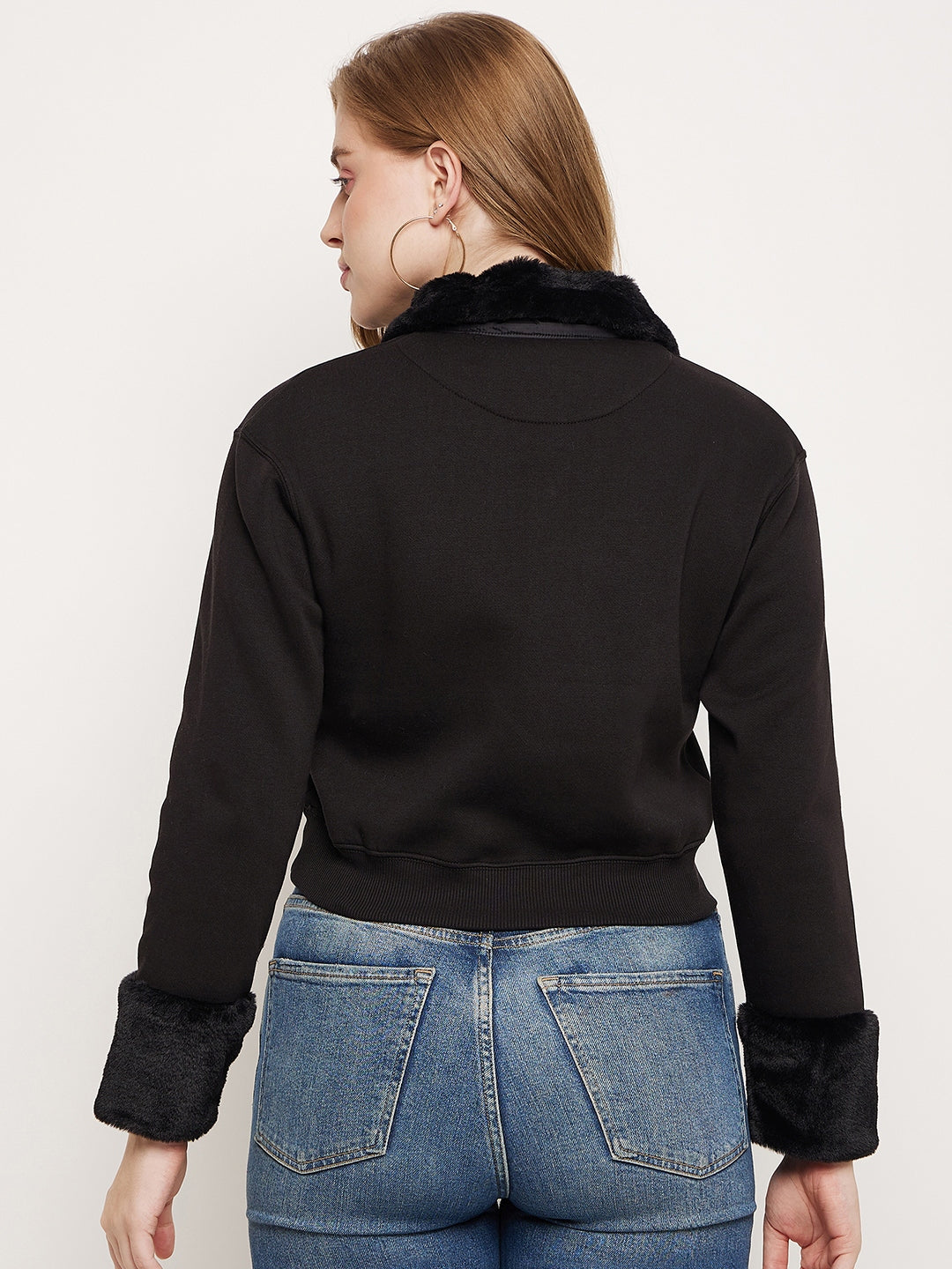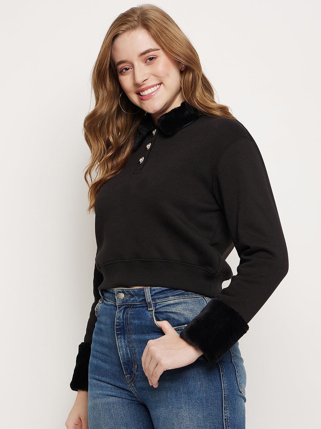 Madame Black Faux Fur Collared Crop Sweatshirt